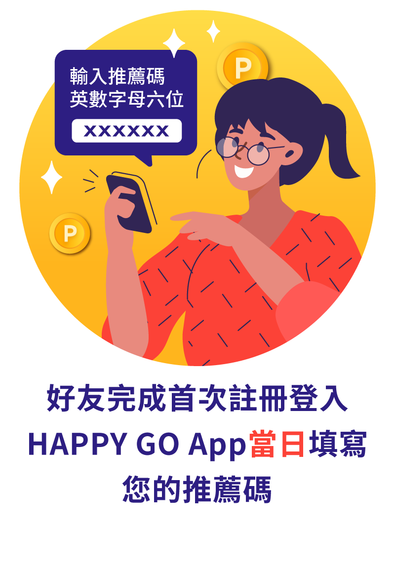 綁定發票手機條碼,如:1/1好友填寫推薦碼,從1/2起計算為第一天,須於1/8前綁定發票手機條碼,您可獲得HAPPY GO點數200點,推薦2位可獲得400點,以此類推。