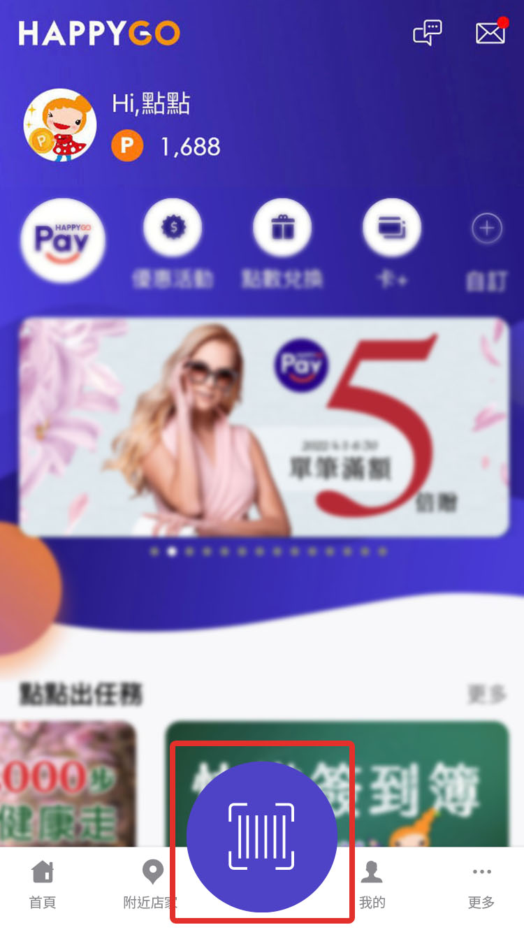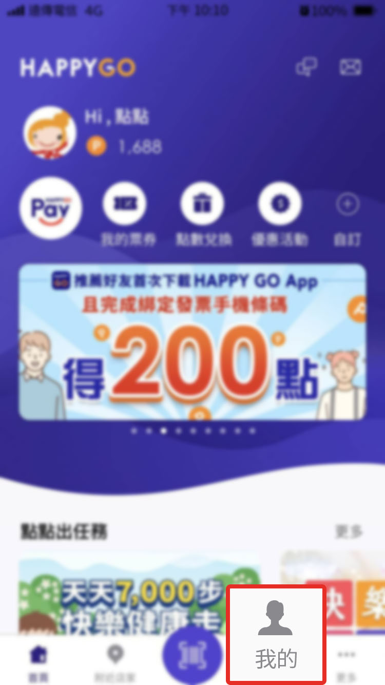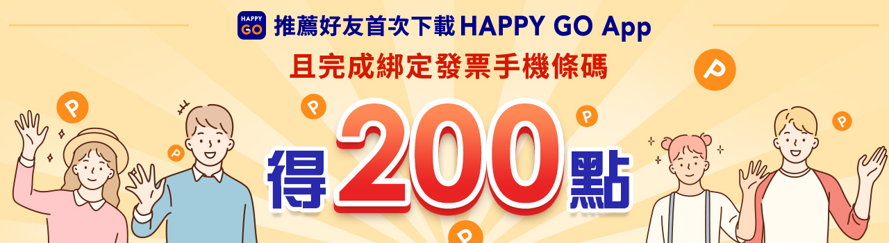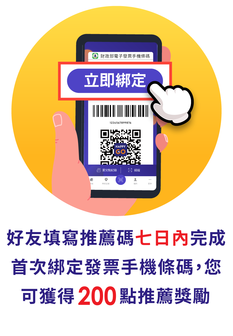 ● 推薦好友首次下載HAPPY GO App,並於七日內完成綁定財政部發票手機條碼,得200點!