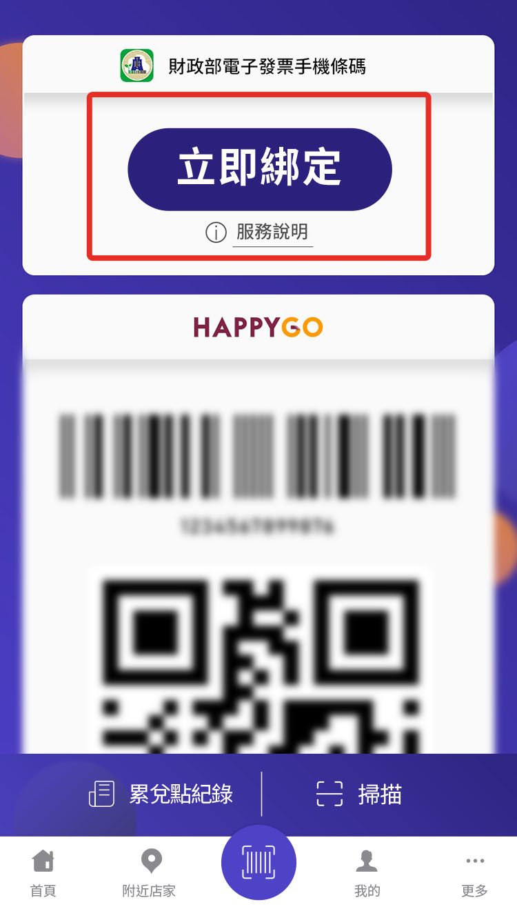 2. 自App首頁點選下方條碼,按下「立即綁定」,依頁面指示步驟完成發票綁定
