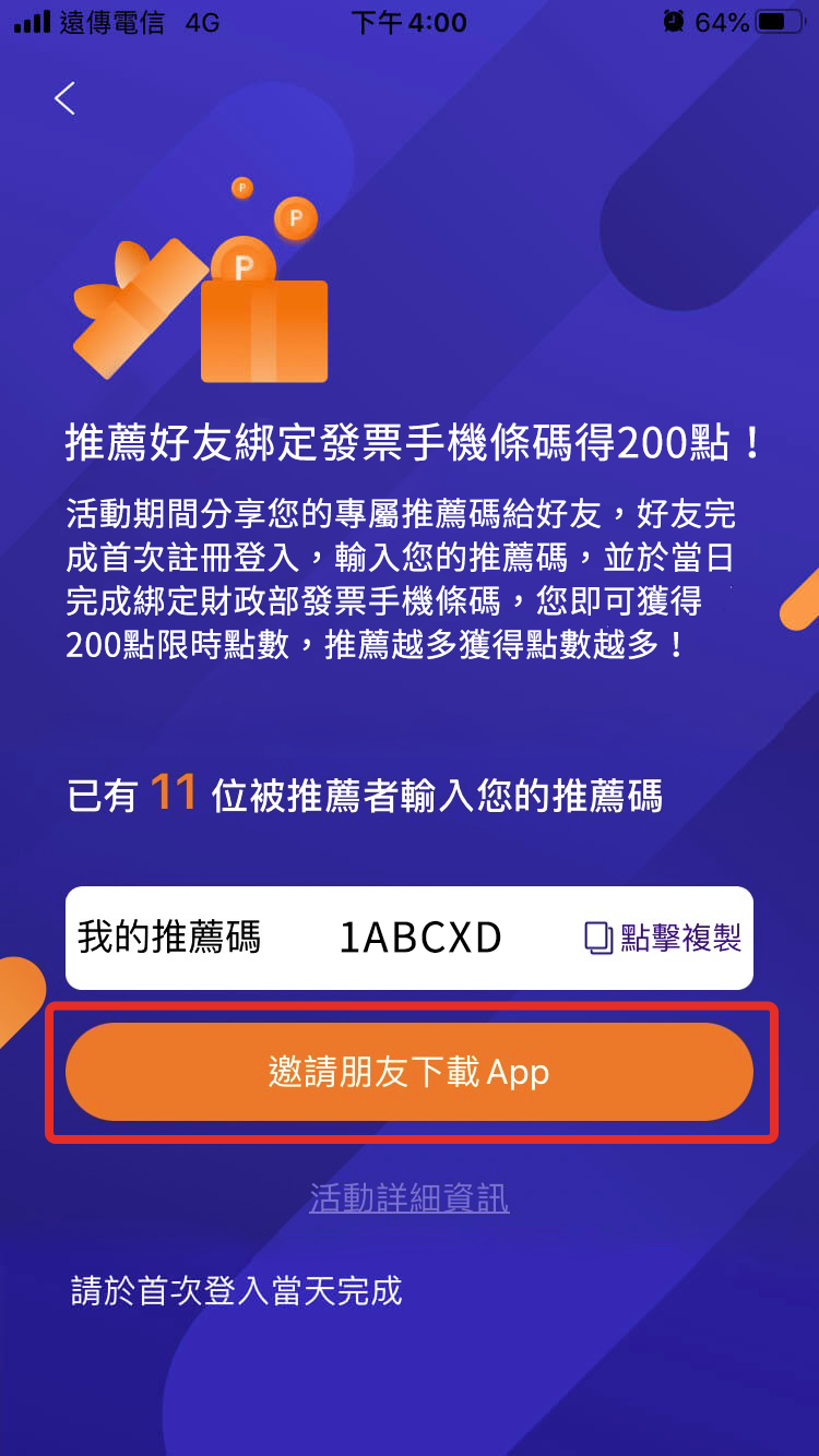 3. 推薦好友下載App且發票綁定活動入點時間為填寫推薦碼後完成發票綁定日隔週五前入點,例如:1/11註冊完成填寫推薦碼, 1/16完成綁定發票手機條碼,1/27入點,以此類推。如好友未於七日內綁定發票手機條碼則不給予200點。